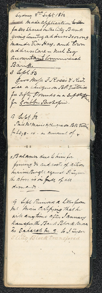 The records held in the Deniliquin & District Historical Society and the National Library of Australia comprise original material generated by Tyson and his business associates. The Deniliquin & District Historical Society’s collection of Tyson documents mostly derives from Tyson’s Heyfield property, which was under the management of C.W.G. Whittakers, though it includes a few letters to and from earlier managers. The National Library holds the papers relating to the case of McEvoy vs. Tyson, a dispute concerning the boundaries of their respective holdings and documents relating to claims to inheritance and to the administration of Tyson's estate, 1898-1907, and Tyson’s only surviving original diary from 1863-1864, the 'Heyfield diary'.
